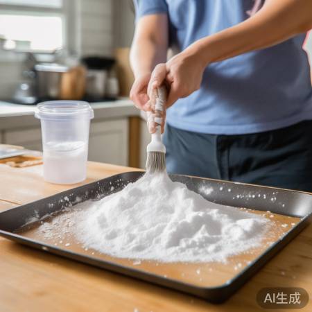 第三步,小苏打粉的魔法。取一小勺小苏打粉,撒在油渍较重的地方,然后用刷子轻轻刷洗。小苏打粉是一种天然的去油剂,对皮肤和环境都无害,用起来超放心。